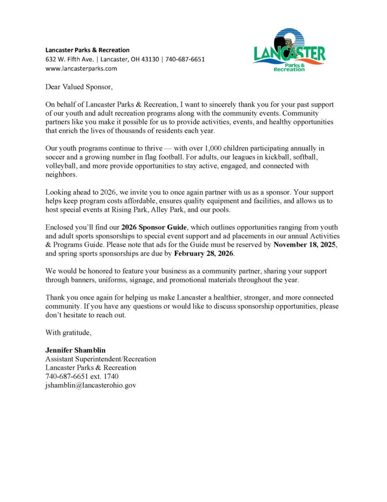To become a sponsor of any of our youth or adult sports, big events or our park guide, please fill out the following sponsor guide and mail to Lancaster Parks & Recreation. Thank you for making our events and programs a success!